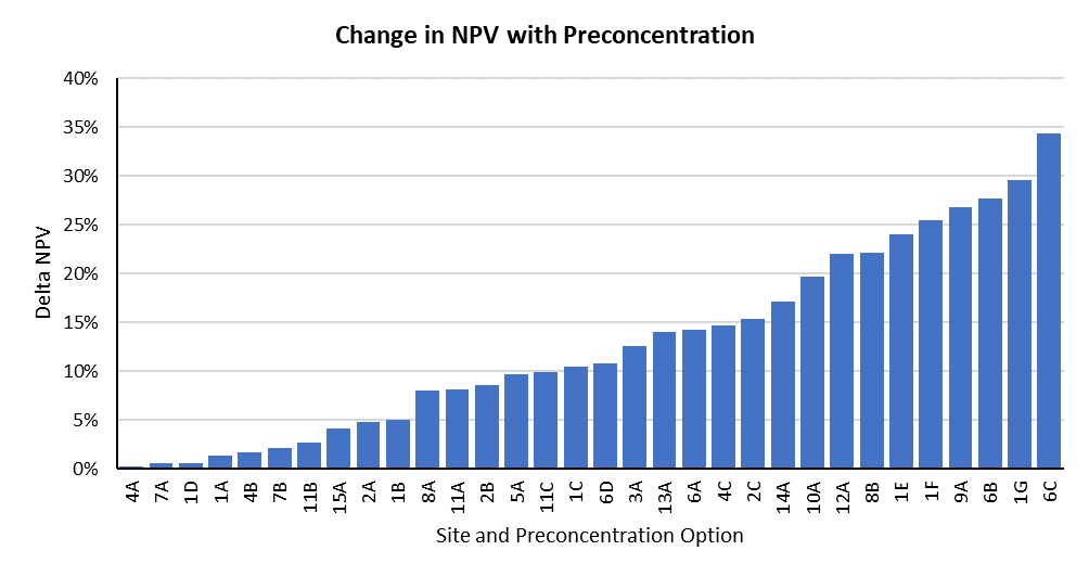 Greenfields projects have greater flexibility to alter site layouts and adjust operational capacities to capture the full benefits provided by preconcentrationMethodologies used to separate gangue from valuable material.. However, there is less ability to trial and test preconcentrationMethodologies used to separate gangue from valuable material. techniques at Greenfield projects, often creating greater uncertainty whether to invest in preconcentrationMethodologies used to separate gangue from valuable material. strategies for Greenfield projects. In the results presented in Table 2, preconcentrationMethodologies used to separate gangue from valuable material. options applied to Greenfield projects returned an average increase of 16.1% NPV, while Brownfield projects returned an average increase of 11.2% NPV with preconcentrationMethodologies used to separate gangue from valuable material.. The largest increase in NPV from the 32 evaluations presented in Table 2 was also a Greenfield project (6C) and provides an excellent example of the additional benefits that can be achieved by altering site layouts and mine designs for preconcentrationMethodologies used to separate gangue from valuable material..